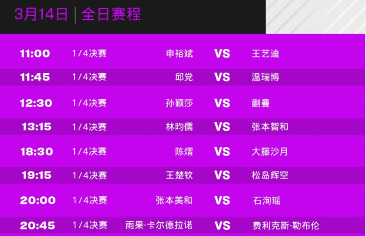另外王艺迪对阵申裕斌,温瑞博对阵邱党,还有张本智和对阵林昀儒,雨果战F勒布伦。